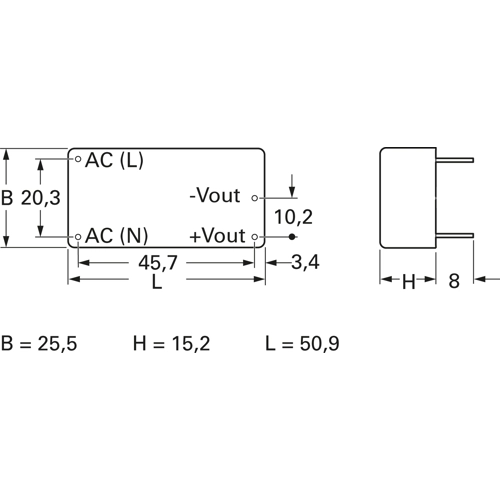 In vergossenem Kunststoffgehäuse mit Lötpins für Leiterplattenmontage, mit Kurzschluss- und Überlastschutz, Funkentstörung gemäß EN 55022 Kl. B und FCC (Level B)
