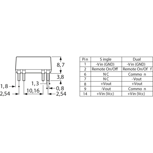 2,0 W Ausführung im DIL-14 Gehäuse; Merkmale: 4 : 1 Weitbereichseingang, keine Grundlast erforderlich, dauerkurzschlussfest, geregelte Ausgänge, extern Ein/Aus. Regelabweichungen: Eingangsänderung ±0,2 %, Laständerung ±1,0 %, Restwelligkeit: 30 mVpp (20 MHz Bandbreite), E/A-Isolation: 1500 VDC, Betriebstemperatur: –40 bis +85 °C, Stromaufnahme im Stand-By Zustand: 2,5 mA.