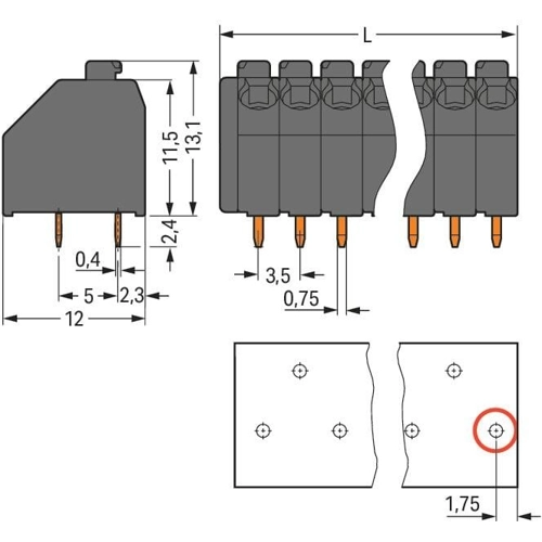 Klemmenleisten im Gurt nach IEC 60286-3 mit Betätigungsdrücker 1 Lötstift/Pol versetzt 2-polig Rastermaß 3,5 mm / 0,138 in Spulendurchmesser 300 mm mit Prüföffnung für Prüfstift bis Ø 1,3 mm Reflow-Technik schwarz