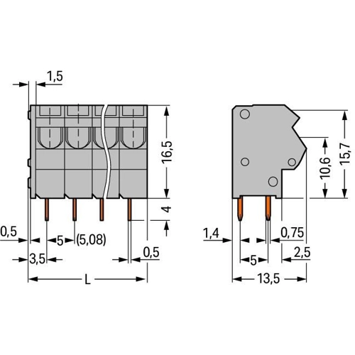 Leiterplattenklemme, 2,5 mm², Rastermaß: 5/5,08 mm, 10-polig, PUSH WIRE, 2,50 mm², grau.