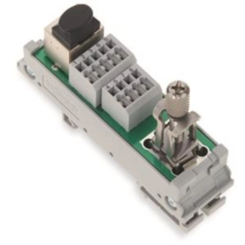 Schnittstellenmodul, RJ-45, Printklemmen, zweireihig, Kat. 5, im Montageträger, mit Schirmanschluss, mit Schirmklemmsattel.