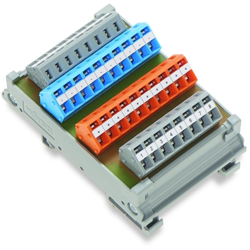 Für 8 Stück 3-Leiter-Initiatoren, mit Cage-Clamp-Anschluss für Querschnittbereich von 0,08 bis 2,5 qmm, Betriebsspannung: 125 V UC, Strom je Anschluss: 1 A, Summenstrom: max. 8,0 A, Nennspannung nach VDE 0110 Teil1/4.97, IEC 60664-1: 125 V/1,5 kV/2, Maße incl. Montagesockel: L 56, B 85, H 34 mm (ab Trageschienen-Oberkante).