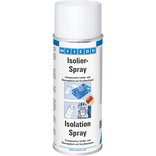 Isolier-Spray ist ein transparenter Isolier- und Überzugslack auf Acrylharzbasis. Es bildet einen flexiblen und widerstandsfähigen Film, welcher hervorragend auf fast allen Werkstoffen wie Metall, Glas, Kunststoff oder Holz haftet. Isolier-Spray ist beständig gegen UV-Strahlen, Säuren, Öle und Laugen. Es ist feuchtigkeits- und witterungsbeständig und zeichnet sich besonders durch seine hohe Durchschlagsfestigkeit aus. Das Spray schützt vor Feuchtigkeit sowie vor verschiedenen Dämpfen. Es dient als Schutzüberzug für Leiterplatten, an elektrischen Verbindungen, Schaltern, Schaltanlagen, elektronischen Bauteilen und Spulen, als Universalversiegelung in der Elektrotechnik oder zum Ausbessern von Isolierungen an Elektromotoren, Wicklungen und Rahmen.