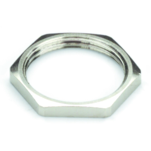 Gegenmutter zur Befestigung von Kabelverschraubungen aus Metall. M63, 6 mm, Messing, vernickelt.