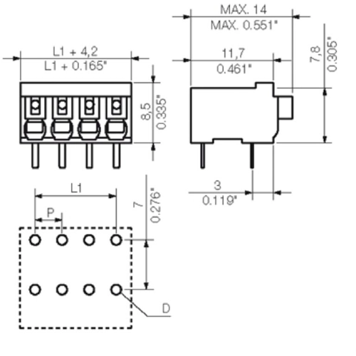 Leiterplattenklemmen, 3,81 mm, Anzahl der Pole: 4, 90°, Lötstiftlänge (l): 3,5 mm, schwarz, Push-In mit Betätigung, Klemmbereich, max. 1,5 mm².