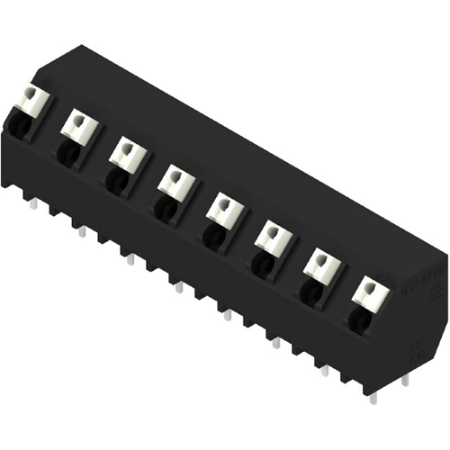 Vollautomatisch bestückbare Leiterplattenklemme für den Reflowprozess (SMT), mit Push In Leiteranschlusstechnik. Leiteranschluss und Betätigungsrichtung des Schiebers aus einer Richtung (TOP).