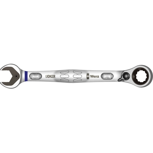 Joker Switch Maul-Ringratschen-Schlüssel, umschaltbar, 16 x 213 mmJoker Maulringratschenschlüssel mit abgewinkelter Ratschenseite und Umschalthebel. Mit Haltefunktion durch Metallplatte im Maul, die die Gefahr des Verlierens von Schrauben und Muttern reduziert. Der integrierte Endanschlag kann das Abrutschen vom Schraubenkopf nach unten verhindern und ermöglicht das Aufbringen hoher Drehmomente. Die auswechselbare Metallplatte im Maul sichert mit extra harten Zähnen Schrauben und Muttern und verringert die Abrutschgefahr. Die Doppelsechskantgeometrie sorgt für die formschlüssige Verbindung mit Schraube oder Mutter und damit ebenso für die Verringerung der Abrutschgefahr. Der geringe Rückschwenkwinkel von nur 30° auf der Maulseite vermeidet zeitintensives Wenden des Schlüssels beim Schrauben. Die umschaltbare Ratschenmechanik auf der Ringseite mit hoher Feinverzahnung (80 Zähne) sorgt für hohe Flexibilität auch in engen Bauräumen. Hörbar präzise Ratschenmechanik. Das robuste zweiteilige Rast-Element ermöglicht darüber hinaus eine extreme Standfestigkeit. Mit um 15° abgewinkelter Ratschenseite für sicheres Arbeiten bei hohen Drehmomenten. Die spezielle Schmiedegeometrie sorgt für hohe Drehmomentübertragung und hohe Biegesteifigkeit. Gefertigt aus leistungsfähigem Chrom-Molybdän-Stahl mit Nickel-Chrom Beschichtung für hohen Korrosionsschutz. Mit Werkzeugfinder "Take it easy": Farbkennzeichnung nach Größen.