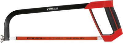 Made of rectangular pipe, powder coated, 2C plastic handle. Saw bow serves as blade cartridge; Blade positions: lock at 90° intervals. Length: 440 mm. Weight: 473 g. Supplied with bi-metal saw blade, 300 mm, 24 teeth/inch.