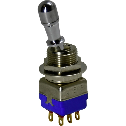 Versatile 12146AK-1V Panel Switch for electrical applications. Features double pole configuration, ON-ON operation, and a single locked position lever for stability and ease of use.