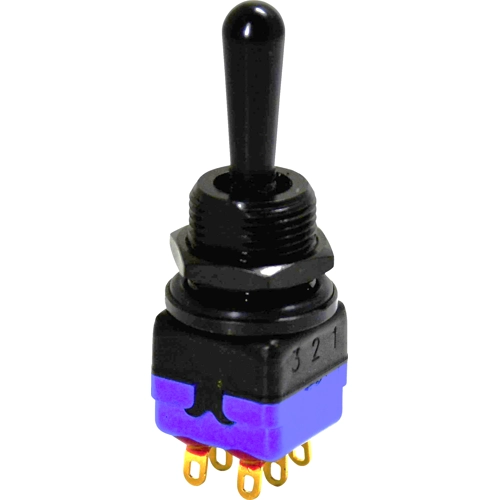 Toggle switch, metal, 2 pole, groping, (On)-Off-(On), 4 A/30 VDC, gold-plated, 12147AD2GX408