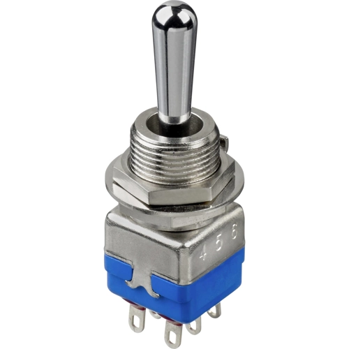 Toggle switch, metal, 2 pole, latching, On-Off-On, 4 A/30 VDC, gold-plated, 12149AD2K