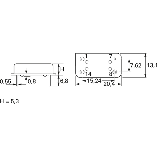 In 14-pole DiL package; Operating temperatures: 0 to +70 °C. Frequency stability: ±50 ppm. Symmetry: 40/60 % at 0.5 VDD. Rise and decay time max. 10 ns. Input voltage: 5.0 VDC ±10 %. Input current: 1.0 to 20 MHz 20 mA, 22 to 40 MHz 30 mA, 45 to 80 MHz 40 mA. Connections: 1/NC, 7/GND, 8/Out, 14/5.0 VDC/C-MOS, compatible, 1-10 TTL gates. Dimension H: 5.3 mm (100 MHz = 7.7 mm).