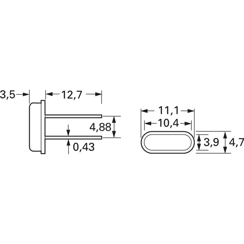 Frequency tolerance: ±30 ppm at +25 °C. Temperature tolerance: 30 ppm. Operating temperatures: –20 to +70 °C. Parallel capacitance: max. 7.0 pF. Insulation resistance: 500 Mohm. Aging: ±5.0 ppm/year.