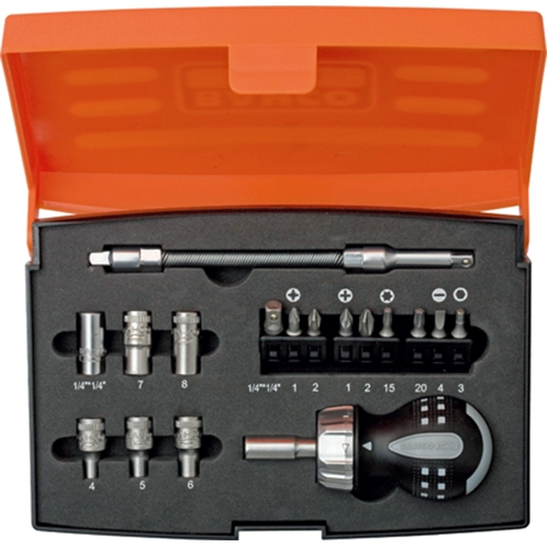 Content: magnetic bit ratchet, short design, 8 bits (PH 1, PH 2, PZ 1, PZ 2, T 15, T 20, SL 4 and HEX 3), 5 bits, 4.0, 5.0, 6.0, 7.0 and 8.0 mm), 1/4" bit holder, 1/4" adapter, 50 mm bit holder, 150 mm flexible adapter.