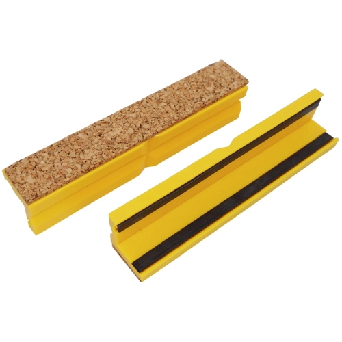 The plastic protective jaws sit perfectly on any vice with steel jaws due to their double magnetic strip. The elastic and firm cork covering protects sensitive parts from scratches or damage. Thanks to the longitudinal and transverse grooves, round objects can also be securely clamped.