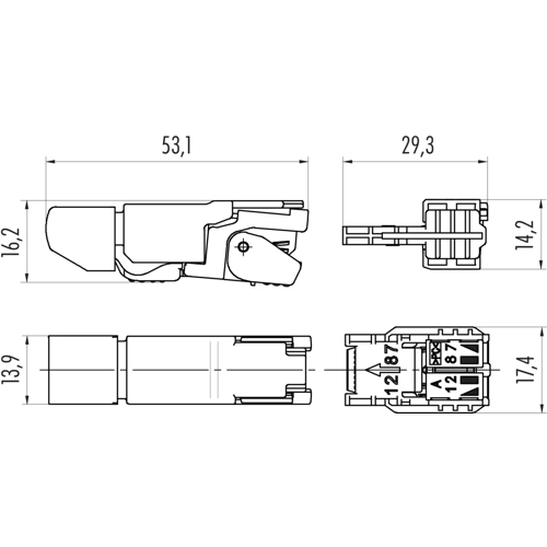M12-X RJ45 connector, Contacts: 4, 5.0-9.0 mm, shieldable, cutting clamp, IP20, UL.
