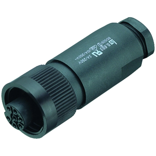 Robust design; Female contact: copper tin. Contact finish: silver-plated. Cable connection: solder terminals max. 0.75 mm². Contact carrier and housing: PBT in accordance with UL 94 V-0. Housing protection class: IP 67. Cable screw coupling: Pg 13.5. Rated voltage: 250 V. Test voltage: 4800 V. Rated current (40 °C): 10 A. Contact resistance: max. 5.0 mohm. Insulation resistance: min. 10 Gohm. Operating temperatures: - 40 to +100 °C. Certifications: VDE, UL, SEV.