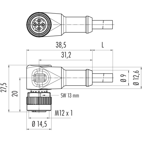 M12-B Female angled connector, Contacts: 3, unshielded, moulded on the cable, IP68, UL, PUR, black, 3 x 0.34 mm², 2 m.