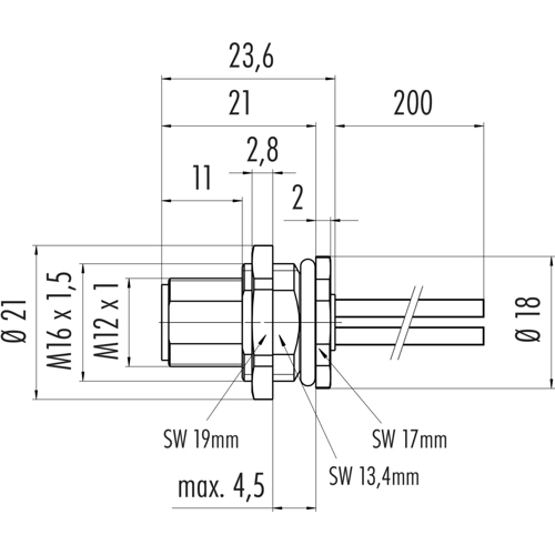 M12-S Male connector, poles 3+PE, unshielded, single wires, IP68, UL, VDE, M16x1.5, front fastened