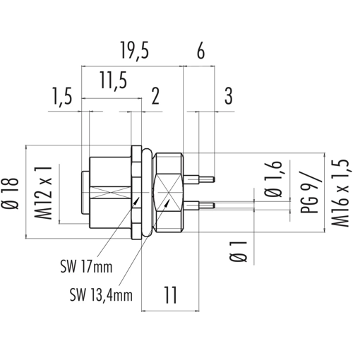 M12-B Female panel mount connector, Contacts: 5, unshielded, THT, IP68, UL, PG 9.