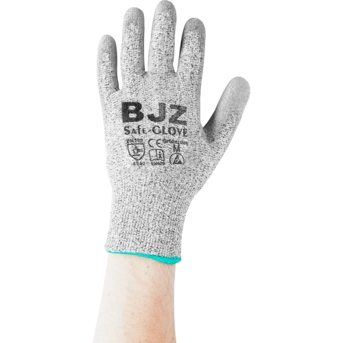 Cut retardant ESD PU palm coated glove, 57% polyethylene 20% nylon 140 D, 3% carbonized fibers polyurethane coating, grey.