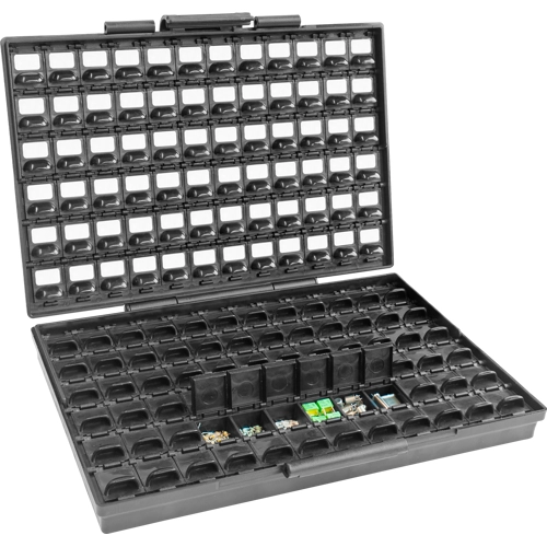 Antistatic SMD assortment box with 144 integrated SMD containers with lid. Ideal for the storage of diodes, ICs, transistors, and SMD components in sizes 1206 / 0805 / 0603 / 0402 / 0201. At less than 500 g, the box is very light. The SMD containers may be marked with a label, whereby faster and easier access to the component is guaranteed. With ESD sign.