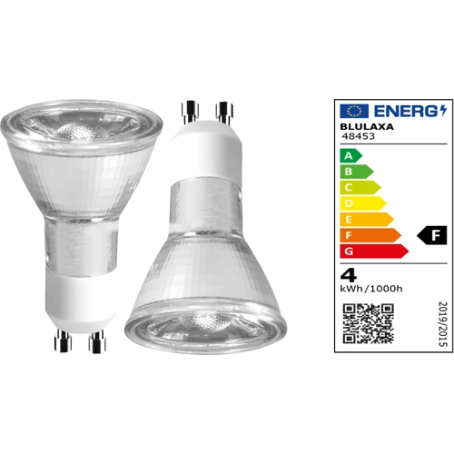 LED lamp, GU10, 4 W, 345 lm, 240 V (AC), 2700 K, 36 °, clear, warm white, F, 48453, package with 2 pieces