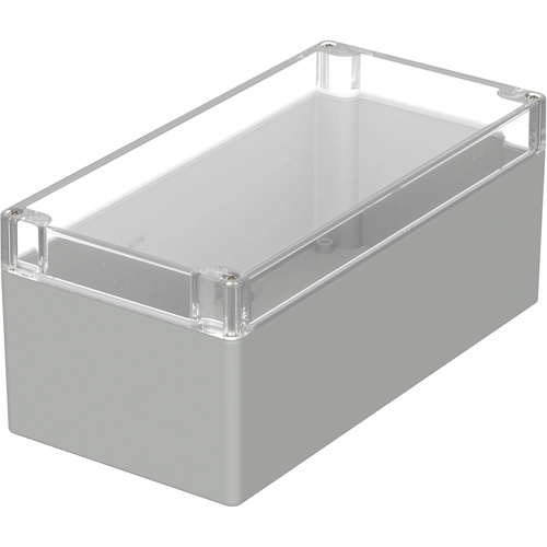 Made of ABS or polycarbonate PC (macrolon), sealed with tongue-and-groove system (encircling PUR or CR round seal in the lid grooves). Lid and base shell joined with captive stainless steel lid screws. Screw channels in a recess outside of the sealed compartment. With mounting pedestals in the base for easy installation of mounting rails, switching elements, terminal blocks etc; Degree of protection to DIN 40050: IP 65. Operating temperature ABS/PC: -40 to +80 °C/ -40 to +100 °C. Combustibility to UL 94 ABS/PC: HB/V 2. Dielectric strength ABS/PC: 24/30 kV. Color: light-gray RAL 7035.