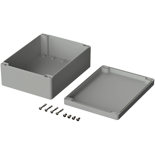 Made of ABS or polycarbonate PC (macrolon), sealed with tongue-and-groove system (encircling PUR or CR round seal in the lid grooves). Lid and base shell joined with captive stainless steel lid screws. Screw channels in a recess outside of the sealed compartment. With mounting pedestals in the base for easy installation of mounting rails, switching elements, terminal blocks etc; Degree of protection to DIN 40050: IP 65. Operating temperature ABS/PC: -40 to +80 °C/ -40 to +100 °C. Combustibility to UL 94 ABS/PC: HB/V 2. Dielectric strength ABS/PC: 24/30 kV. Color: light-gray RAL 7035.