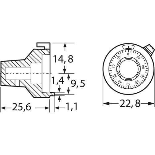 Rotary knob counter for use with precision potentiometers or other rotating devices, up to 15 turns. Designed for use with plastic shafts.