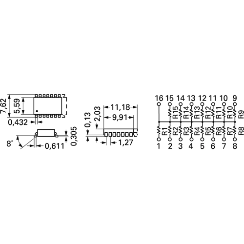 Thickfilm, medium package size (5.59 mm), to E.I.A/SOGN-2002 standard, interconnected resistors (same value) with common connection (bussed resistors)