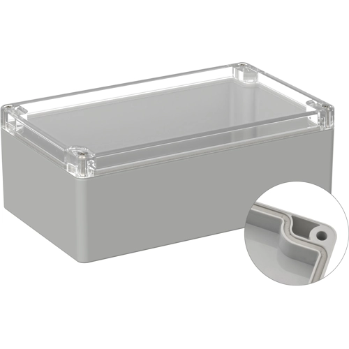 High-quality industrial enclosure made of polycarbonate with transparent cover. The enclosure is suitable for outdoor use. Factory-fitted round cord seal. Cover screws are screwed into high-quality threaded bushings, no thread wear even after repeated opening. Circuit boards and mounting plates can be securely fastened in the lower section using screw domes. The cover screws, which are secured against falling out, are screwed into high-quality threaded bushings. The enclosure can be mounted on the wall using the screw channels in the lower section. Large machining surfaces and versatile mounting options for connectors, switches, and buttons.