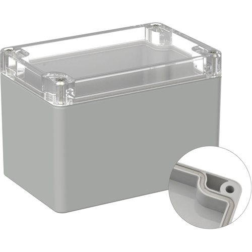 High-quality industrial enclosure made of polycarbonate with transparent cover. The enclosure is suitable for outdoor use. Factory-fitted round cord seal. Cover screws are screwed into high-quality threaded bushings, no thread wear even after repeated opening. Circuit boards and mounting plates can be securely fastened in the lower section using screw domes. The cover screws, which are secured against falling out, are screwed into high-quality threaded bushings. The enclosure can be mounted on the wall using the screw channels in the lower section. Large machining surfaces and versatile mounting options for connectors, switches, and buttons.
