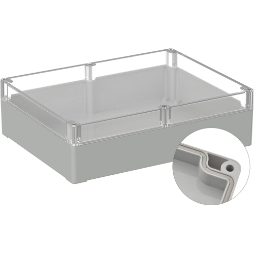 High-quality industrial enclosure made of polycarbonate with transparent cover. The enclosure is suitable for outdoor use. Factory-fitted round cord seal. Cover screws are screwed into high-quality threaded bushings, no thread wear even after repeated opening. Circuit boards and mounting plates can be securely fastened in the lower section using screw domes. The cover screws, which are secured against falling out, are screwed into high-quality threaded bushings. The enclosure can be mounted on the wall using the screw channels in the lower section. Large machining surfaces and versatile mounting options for connectors, switches, and buttons.