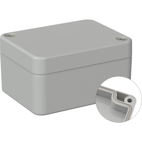 High-quality industrial housing made of ABS, factory-fitted round cord seal. Cover screws screwed into high-quality threaded bushings, no thread wear even after repeated opening. Circuit boards and mounting plates can be securely fastened in the lower section using screw domes. The cover screws, which are secured against falling out, are screwed into high-quality threaded bushings. The enclosure can be mounted on the wall using the screw channels in the lower section. Large machining surfaces and versatile mounting options for connectors, switches, and buttons.