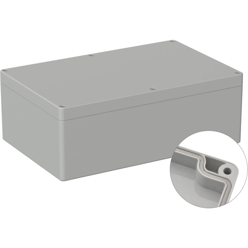 High-quality industrial housing made of ABS, factory-fitted round cord seal. Cover screws screwed into high-quality threaded bushings, no thread wear even after repeated opening. Circuit boards and mounting plates can be securely fastened in the lower section using screw domes. The cover screws, which are secured against falling out, are screwed into high-quality threaded bushings. The enclosure can be mounted on the wall using the screw channels in the lower section. Large machining surfaces and versatile mounting options for connectors, switches, and buttons.