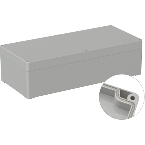 High-quality industrial housing made of ABS, factory-fitted round cord seal. Cover screws screwed into high-quality threaded bushings, no thread wear even after repeated opening. Circuit boards and mounting plates can be securely fastened in the lower section using screw domes. The cover screws, which are secured against falling out, are screwed into high-quality threaded bushings. The enclosure can be mounted on the wall using the screw channels in the lower section. Large machining surfaces and versatile mounting options for connectors, switches, and buttons.