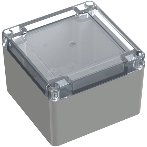 High-quality industrial enclosure made of polycarbonate with transparent cover. Recessed area in the upper section for flush mounting of display screens and membrane keyboards. The cover screws, which are secured against falling out, are screwed into high-quality threaded bushings. Circuit boards can be securely fastened in the lower section using screw domes. Machining surfaces and versatile mounting options for connectors, switches, and buttons.