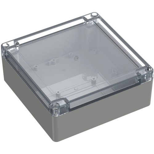 High-quality industrial enclosure made of ABS/polycarbonate with transparent cover. Recessed area in the upper section for flush mounting of display screens and membrane keyboards. The cover screws, which are secured against falling out, are screwed into high-quality threaded bushings. Circuit boards can be securely fastened in the lower section using screw domes. Machining surfaces and versatile mounting options for connectors, switches, and buttons.