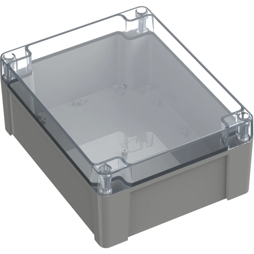 High-quality industrial enclosure made of polycarbonate with transparent cover. Recessed area in the upper section for flush mounting of display screens and membrane keyboards. The cover screws, which are secured against falling out, are screwed into high-quality threaded bushings. Circuit boards can be securely fastened in the lower section using screw domes. Machining surfaces and versatile mounting options for connectors, switches, and buttons.