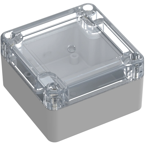 High-quality industrial enclosure made of ABS/polycarbonate with transparent cover. Recessed area in the upper section for flush mounting of display screens and membrane keyboards. The cover screws, which are secured against falling out, are screwed into high-quality threaded bushings. Circuit boards can be securely fastened in the lower section using screw domes. Machining surfaces and versatile mounting options for connectors, switches, and buttons.