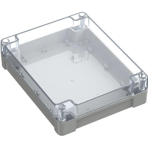 High-quality industrial enclosure made of ABS/polycarbonate with transparent cover. Recessed area in the upper section for flush mounting of display screens and membrane keyboards. The cover screws, which are secured against falling out, are screwed into high-quality threaded bushings. Circuit boards can be securely fastened in the lower section using screw domes. Machining surfaces and versatile mounting options for connectors, switches, and buttons.