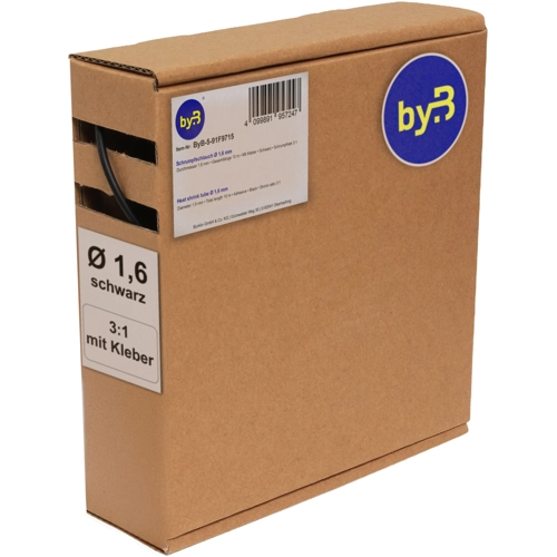 The BYB-5-91F9715 is a shrink tubing with inner adhesive. This high-quality heat-shrinking-tube is particularly suitable for service workshops, electronics technicians and laboratory needs. Supplied in a practical carton dispenser box for easy handling and dust-free and tidy storage even after opening. The product can be used for insulation, protective covering of components, as antikink protection, anti-corrosion, as well as repair of cables and lines, and much more.