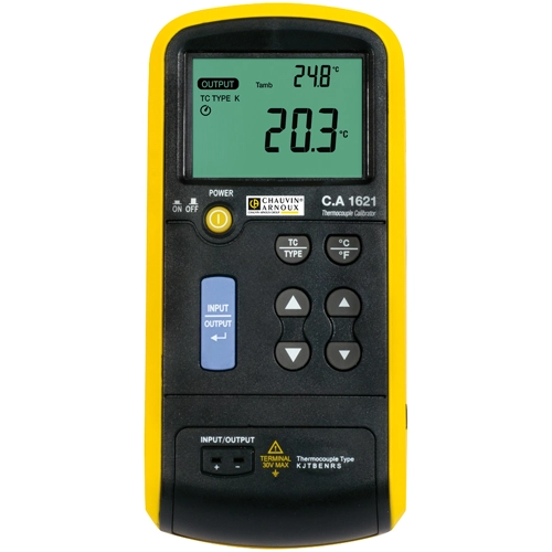 The compact, simple-to-use C.A 1621 thermocouple temperature calibrator is capable of measuring and simulating up to 8 types of thermocouples (J, K, T, E, R, S, B, N), as well as a voltage in mV. When used as a battery-powered stand-alone instrument, it offers a long battery life in the field. When connected to the mains, it can be used continuously without any time limit.