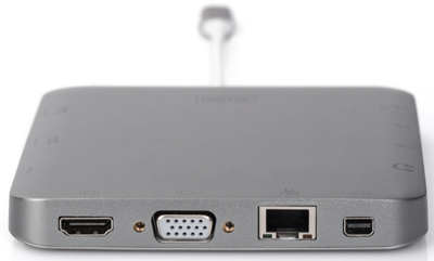 The fully functional universal docking station, USB Type-C offers you everything to create a fully equipped workspace. It offers three video interfaces (HDMI, Mini DP, VGA), where two monitors can be operated at the same time. In addition, it offers three USB 3.0 ports, where one port (5 V / 1.5 A) also provides a charging function for mobile devices. The USB interfaces are supplemented by a USB-C with power delivery (PD 2.0) functionality.