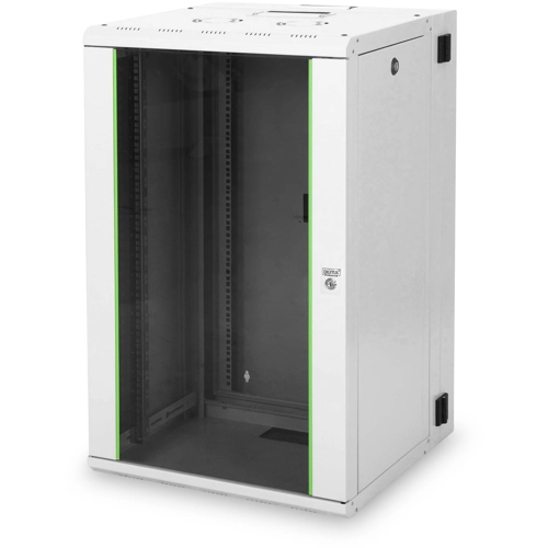 20U wall-mounted enclosure, Unique, 998x600x600 mm two-piece, hinged, gray ( RAL 7035) The DIGITUS® Professional Unique series is manufactured, designed and developed for the high demands of IT infrastructure. - Robust steel construction for stable wall mounting - Lockable security glass door with steel frame - Side panels are lockable and removable The Unique series wall-mounted enclosures are designed for user-friendly installation of active and passive network components along with neat cabling. Each cabinet is made of up to 1.5 mm thick sheet steel and provides a very good stability as a robust steel construction. Colors are powder coated in gray (RAL 7035) and black (RAL 9005). Wall mounting is easy and can be done quickly. Optionally, the enclosures can also be installed free-standing with leveling feet or casters available separately. The door and side panels can be easily disassembled, and a door stop can be changed. The roof is prepared to accept a fan module for active venting. Each wall-mounted enclosure includes a pair (2 pieces) of mounted 483 mm (19") profile rails inside. These are galvanized, have a height unit marking (countable in both directions) and are adjustable in depth. The rear frame also has a 483 mm (19") perforation. An important aspect of the installation is the cable management. In the roof of each cabinet there is a slide-on cable inlet with a foam rubber seal. The rear panel and the bottom panel are equipped with punched cable inlets with plastic cover. In addition, the rear frame is equipped with brush strips on the top and bottom. An extensive available portfolio of accessories for cable routing, shelves, etc. helps to meet many requirements of daily practice.