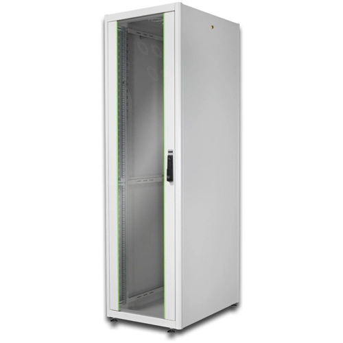 42U network cabinet, Dynamic Basic 2040x600x800 mm, color gray (RAL 7035) The DIGITUS® Dynamic Basic series is manufactured, designed and developed for the high requirements of the IT infrastructure - Roof is prepared to accommodate a fan element (punched receptacles) - Lockable swivel lever handle on the front door - Floor with punched cable inlet, covered with screwed plate The Dynamic Basic cabinets are designed for user-friendly installation of active and passive network components accompanied by clean cabling. Each cabinet is made of up to 1.5 mm thick sheet steel and provides very good stability due to special sheet metal bending technology as a robust steel construction. The color is achieved by powder coating in gray (RAL 7035) and black (RAL 9005). In special cases, the cabinets can be disassembled to reach hard-to-reach installation sites. The doors can be easily disassembled, a change of door hinges can be made. Furthermore, the roof is prepared to accommodate a fan module for active ventilation. The cabinets include 2 pairs (4 pieces) of mounted 483 mm (19") profile rails inside. These are galvanized and have a height unit marking (countable in both directions). They can be adjusted in depth and are also connected to depth stays in the cabinet to allow intensive expansion with 483 mm (19") components. An important aspect of the installation is the cable management. Each cabinet is equipped with a punched cable inlet with cover plate in the bottom. The bottom of cabinets with a width of 800 mm and more is additionally extended with punched-out cable inlets with plastic cover on the left and right. In the roof these are 1x for cabinets with 600 mm width and 3x from 800 mm width. An extensive portfolio of accessories for cable routing, shelves, etc. helps to meet many requirements of daily practice.