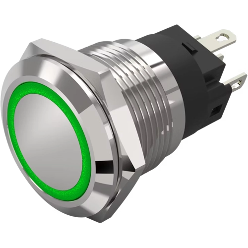 Illuminated pushbutton Ø 19 mm silver contact, Maintained, 12 V AC/DC, 1 C, Soldering terminal, 2.8 x 0.5 mm, round, Stainless steel, Green, Silver.