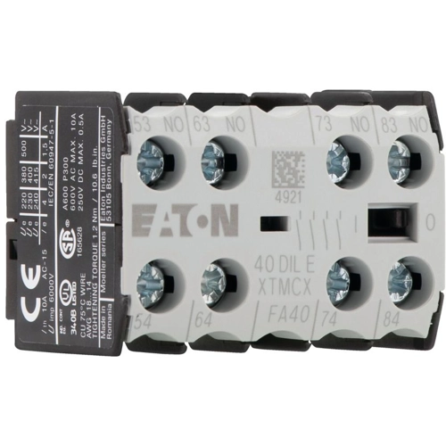 This auxiliary contact module features four poles with four normally open contacts, designed for front mounting and equipped with screw terminals.