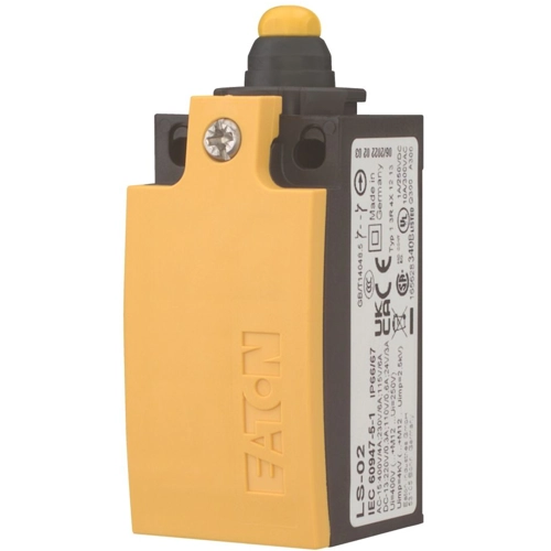 This device features a position switch with a rounded plunger, designed as a basic, expandable unit. It includes two normally closed (NC) contacts and is equipped with screw terminals. The device is yellow in color and constructed from insulated material, operating effectively within a temperature range of -25 to +70 °C.